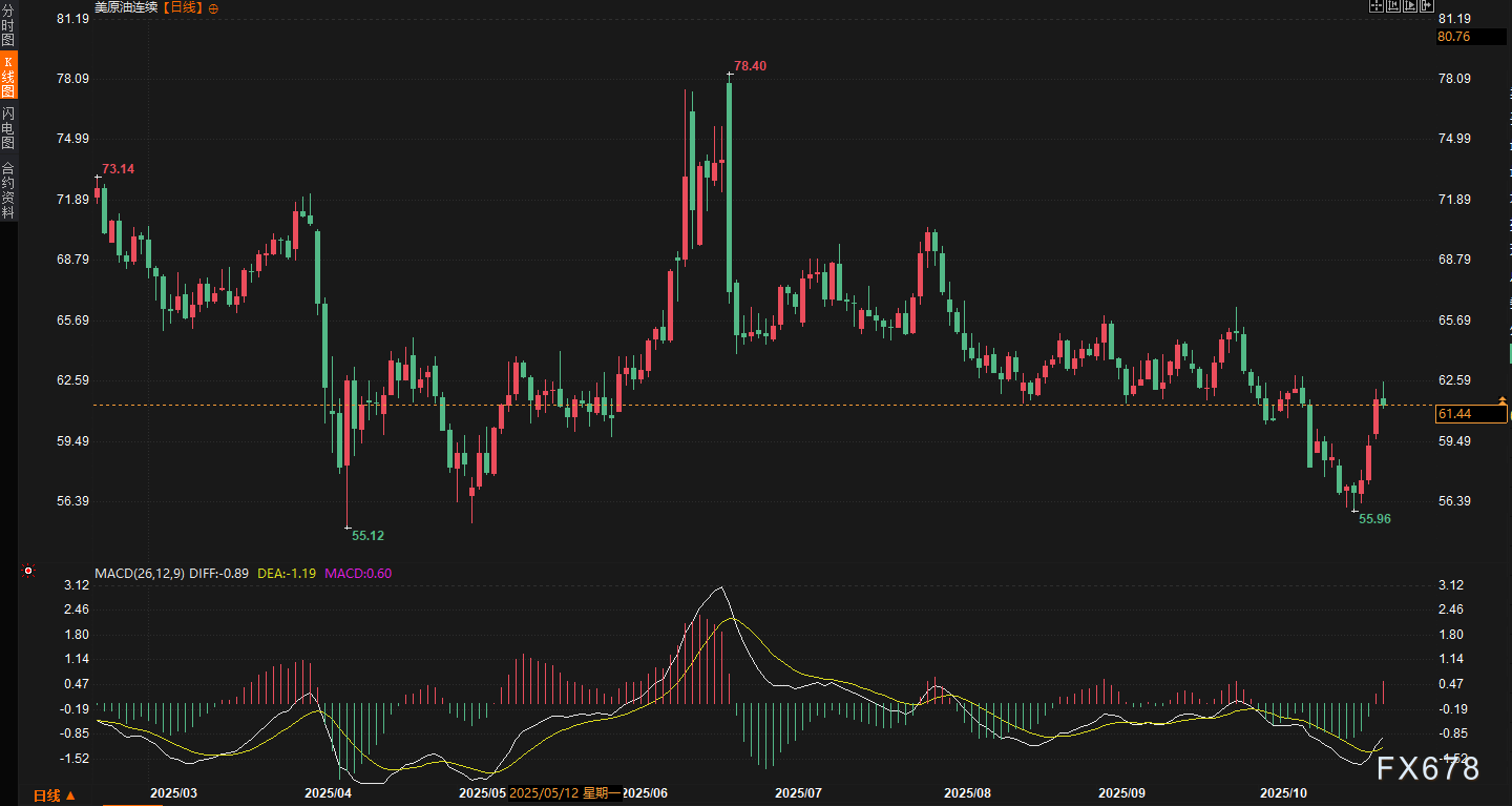 汇通财经APP讯——本周(10月20日至25日),国际原油市场在不确定性中迎来显著反弹。尽管周初受供应过剩担忧拖累,WTI和布伦特原油双双触及五个月低点,但中后期因美国对俄罗斯石油企业的制裁消息而快速拉升,最终周五小幅回落,WTI收于61.75美元/桶,布伦特报65.88美元/桶,双双录得约7%的周涨幅。这一波行情的核心看点在于市场对特朗普政府新制裁执行力度的反复权衡,以及贸易紧张局势的潜在缓和信号,这些因素交织推动油价从低谷反弹,但也为下周领导人会晤埋下更多变数。