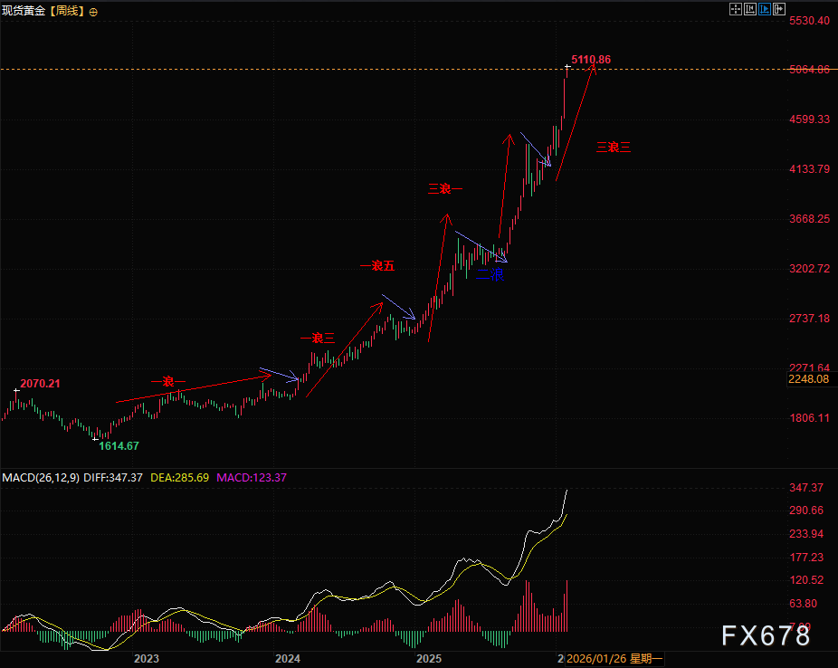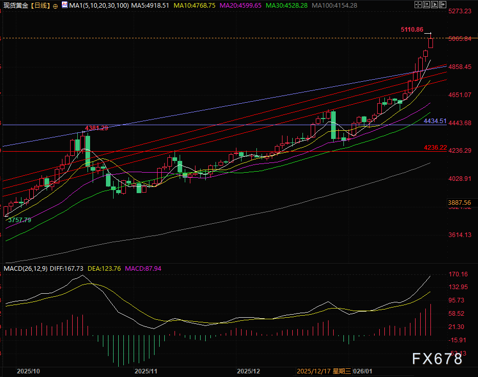 汇通财经APP讯——周一(1月26日)国际金价超预期延续强势表现,跳空高开0.49%之后大幅上扬逾2%,成功突破每盎司5000美元关口,盘中一度涨至5110,再创历史新高,目前交投于5090附近。