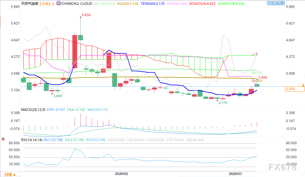 周一(3月9日)欧盘时段,受原油期货大幅上涨带动,美国天然气期货在周日晚间跳空高开后,继续小幅上行。虽然涨幅不及原油,但中东战事同样对天然气供应构成威胁。霍尔木兹海峡仍对油轮关闭,引发欧洲与亚洲地区天然气短缺担忧。