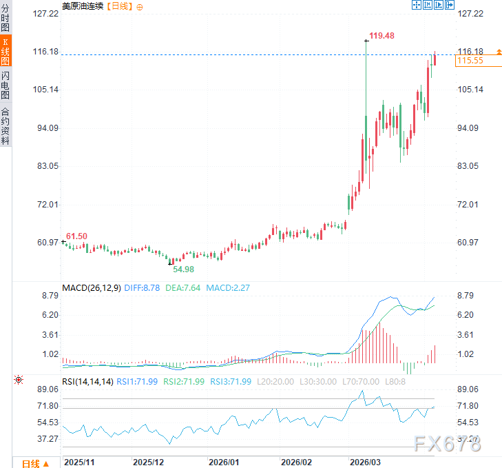 霍尔木兹海峡持续封锁,全球能源风险高企,周二(4月7日)亚市时段,美原油价格震荡上行,现交投于每桶115.30美元附近,日内涨幅约2.55%,此前一度触及116.56美元的近一个月高点。