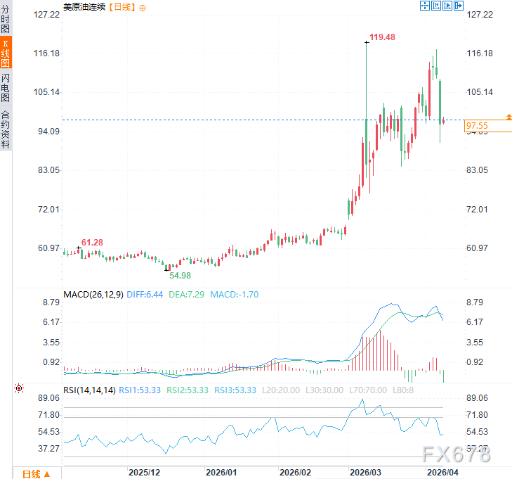 受此影响,美原油价格在周三触及91美元/桶附近后,回升超2.5%,周四亚市时段延续震荡上行,现交投于每桶97.70美元附近,日内涨幅约3.4%,停火协议的实际不确定性下,油价或继续上探。