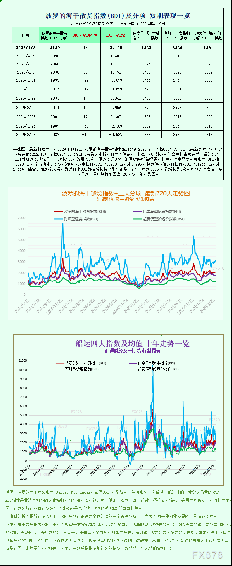 汇通财经APP讯——最新数据显示,2026年4月9日 波罗的海干散货指数(BDI)报 2161 点,创2026年3月4日以来新高水平,环比(较前值)涨1.03%,且为连续第5天上涨(含0增长)。综合短...