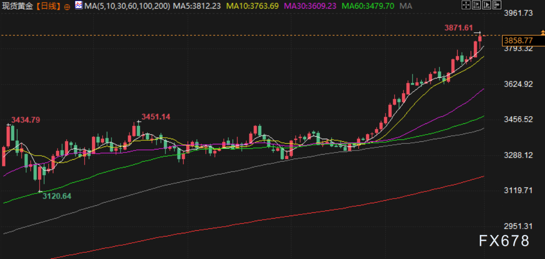 现货金上涨0.3%,报每盎司3843.43美元,从北美时段稍早的跌势中反弹。亚洲交易时段,金价一度创下3871.61美元的纪录新高。12月交割的美国期金收高0.5%,结算价报3873.20美元。