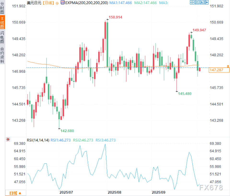 汇通财经APP讯——本周日元依旧保持强势,美元兑日元曾连续四个交易日下行创两周新低,周四(10月2日)亚市早盘时段陷入连跌后的技术整理阶段,但短期整理不影响整体趋势,后续空头或仍占主导地位。因美国就业数据疲软再度点燃美联储降息预期。日本央行两名政策委员在最新会议上对货币政策提出异议,加之短观调查显示制造业与非制造业景气度均具韧性,市场对日本收紧政策的预期升温进一步推高日元。市场正聚焦周五公布的非农就业报告以寻找下一动向线索。