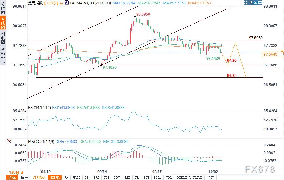 汇通财经APP讯——周四(10月2日)欧洲交易时段,美元指数(DXY)小幅走跌,盘中报97.58,跌幅0.16%。继隔夜小幅反弹后,该指数动能不足。美元指数已连续第五个交易日出现下跌。美元进一步上涨空间受限,市场情绪保持谨慎。