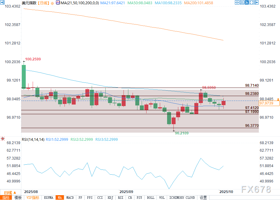 汇通财经APP讯——周四(10月2日)美盘时段,美元指数(DXY)承压下行,跌至97.522的近一周低点。这一走势源于市场消化美国疲软就业数据及持续政府停摆的影响。然而,早盘中段美元开启回升走势,尽管反弹背后并无明确基本面驱动因素,指数仍短暂转涨。