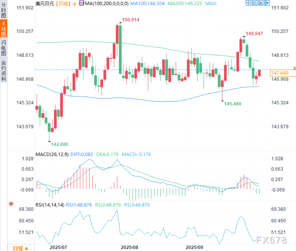 汇通财经APP讯——美元兑日元周五(10月3日)连续第二个交易日走强,目前交投于147.75附近,涨幅约0.3%,进一步远离前日触及的两周低位(146.57)。早间公布数据显示,日本8月失业率升至2.6%,超出预期。尽管美国政府陷入停摆,但市场风险情绪回暖,叠加日本国内政治不确定性,共同削弱了避险日元吸引力。