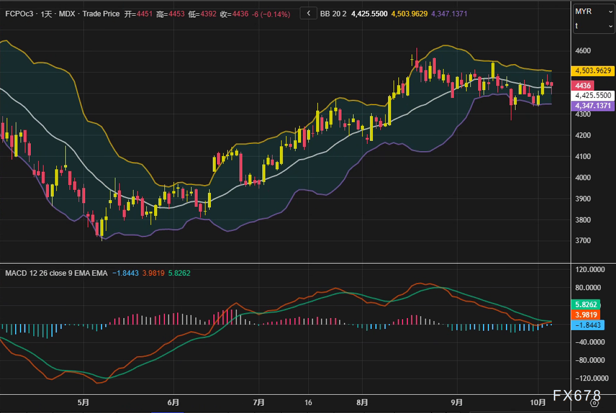 汇通财经APP讯——周一(10月6日),马来西亚衍生品交易所棕榈油主力合约FCPOc3收于4436林吉特/吨,日内下跌6林吉特,跌幅0.14%,延续前一交易日的疲软态势。日线图上,布林带中轨位于4503.96林吉特,MACD指标虽仍处负值区间,但柱状线收窄至-1.84,暗示短期下行动能有所减弱。
