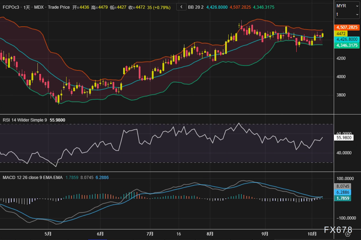 汇通财经APP讯——周二(10月7日),马来西亚棕榈油期货结束两日连跌,主力合约FCPOc3收报4472林吉特/吨,单日上涨35林吉特,涨幅0.79%。技术面上,布林带上轨位于4507林吉特附近,MACD柱状线收于6.29,快慢线呈多头排列,显示短期动能转向积极。