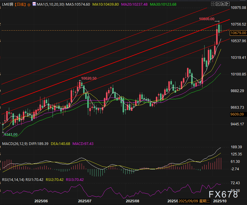 汇通财经APP讯——周二(10月7日)亚欧时段,LME铜价走出冲高回落走势,目前涨0.24%,交投于10678美元/吨。值得注意的是周一铜价高开0.46%之后冲高涨至10800创一年半新高后回落,短暂喘息后,铜价有望继续上涨。