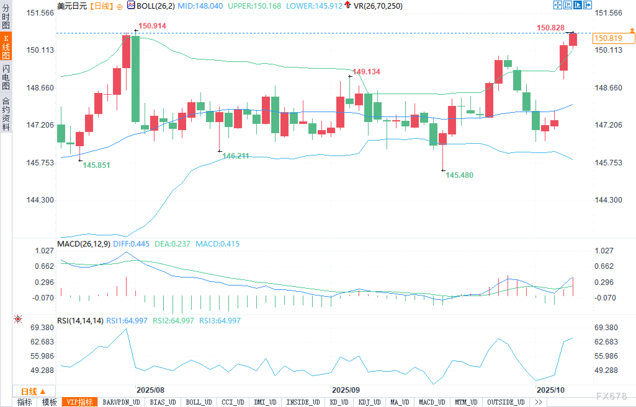 汇通财经APP讯——周二(10月7日),欧洲时段美元兑日元延续走强至150.50上方。汇价跟随美元整体上涨而抬升;与此同时,日元继续明显跑输主要货币,市场围绕日本新任首相高市早苗的政策取向重估日本央行的后续路径。