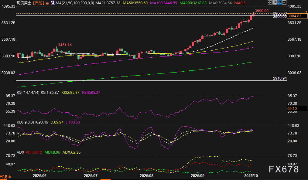 汇通财经APP讯——周二(10月7日)美盘时段,现货黄金延续历史性涨势,盘中触及近3991美元的历史新高。受美国政府长期停摆、市场对美联储进一步降息预期升温影响,投资者纷纷转向避险资产,推动这一贵金属价格上涨,反映出市场焦虑情绪不断加剧。