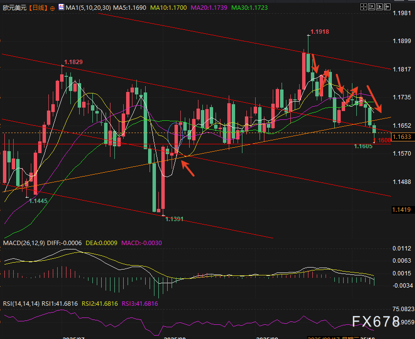 汇通财经APP讯——周三欧洲交易时段,欧元兑美元延续承压态势,继周二下跌约0.5%后,汇率继续下探一度跌至1.1600附近跌幅-0.44%,目前反弹至1.1635附近,跌幅收窄至-0.18%。从技术面逻辑来看,短期内卖方大概率仍将主导市场节奏。欧洲央行穆勒表态下午表示当前通胀水平已处于我们的目标区间内,削弱了短期加息的可能。除此之外当前压制欧元走势的因素总结如下。