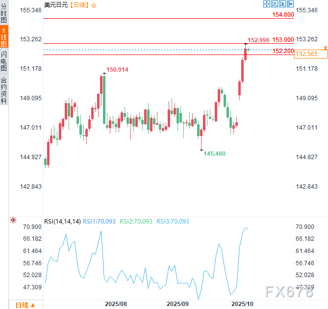 10月09日 09:19汇通财经APP讯——周三(10月8日),北美时段美元兑日元继续保持上行,于152.50附近交投,距当日高点152.996不远。自上周收盘以来,汇价累计拉升逾500点,刷新自1月末以来的新高。基本面与技...