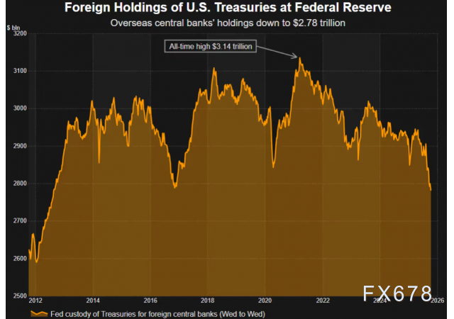 —纽约联储代全球央行持有的美国国债规模已降至十多年来最低水平,令市场对外国投资者是否仍青睐美债及其他美元资产的疑虑再度升温。