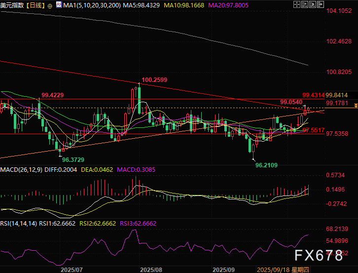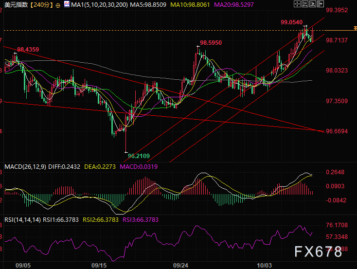 周四(10月9日)亚欧时段美元指数继续上涨,目前涨0.16%,交投于98.99附近。美元指数自96.21后大幅反弹,这次又已经走出四连阳,但其实市场上并没有太多利好美国的数据发布。