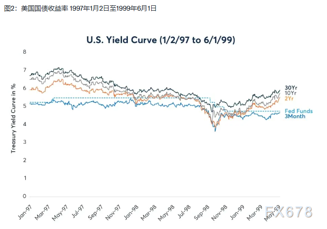 在1997年3月加息后,美国国债收益率在1998年前两次降息前及降息期间持续走低,随后在第三次降息前开始回升并保持上行趋势(图2)。在此期间失业率持续下降。