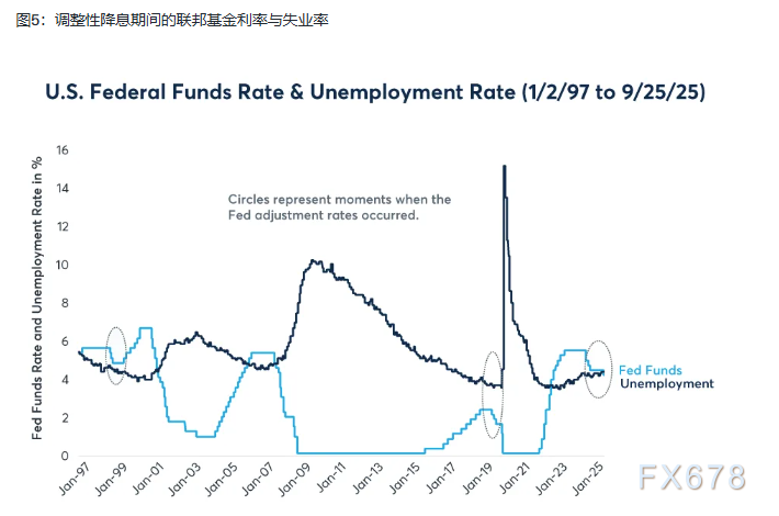 图5中的黑色虚线圆圈标注了美联储调整降息的时点,以及随后几个月联邦基金利率和失业率的变化情况。