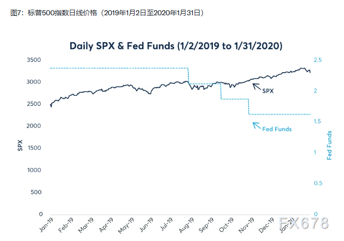 2019年7月降息前,标普500指数呈横盘整理微幅上行态势。2019年7月26日股市见顶后,随着美联储7月31日实施调整性降息,股指下跌1.5%。但标普500指数于8月14日触底,回撤幅度达5.6%,随后在10月28日创出新高(图7)。