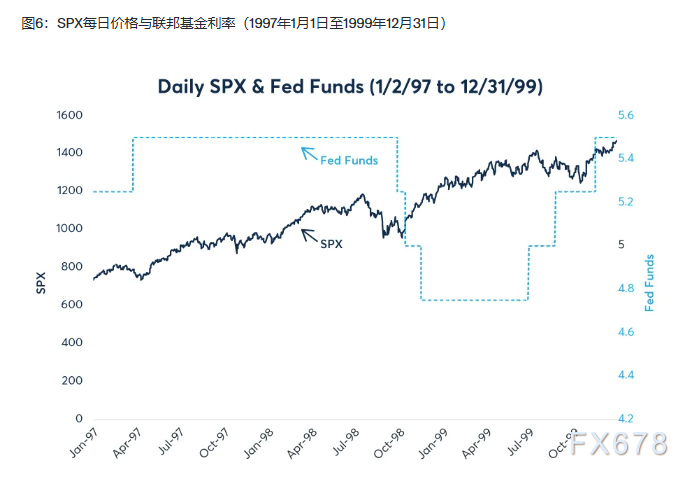 1998年8月17日俄罗斯卢布贬值时,标普500指数(SPX)早在8月14日就已较7月17日的峰值回调10.4%,并于8月31日触底,跌幅达19.3%(图6)。1998年10月8日,就在美联储于10月15日实施第二次25个基点降息前夕,标普500指数再次测试了低点。随后股市开始回升,截至12月中旬,标普500指数已突破此前高点。