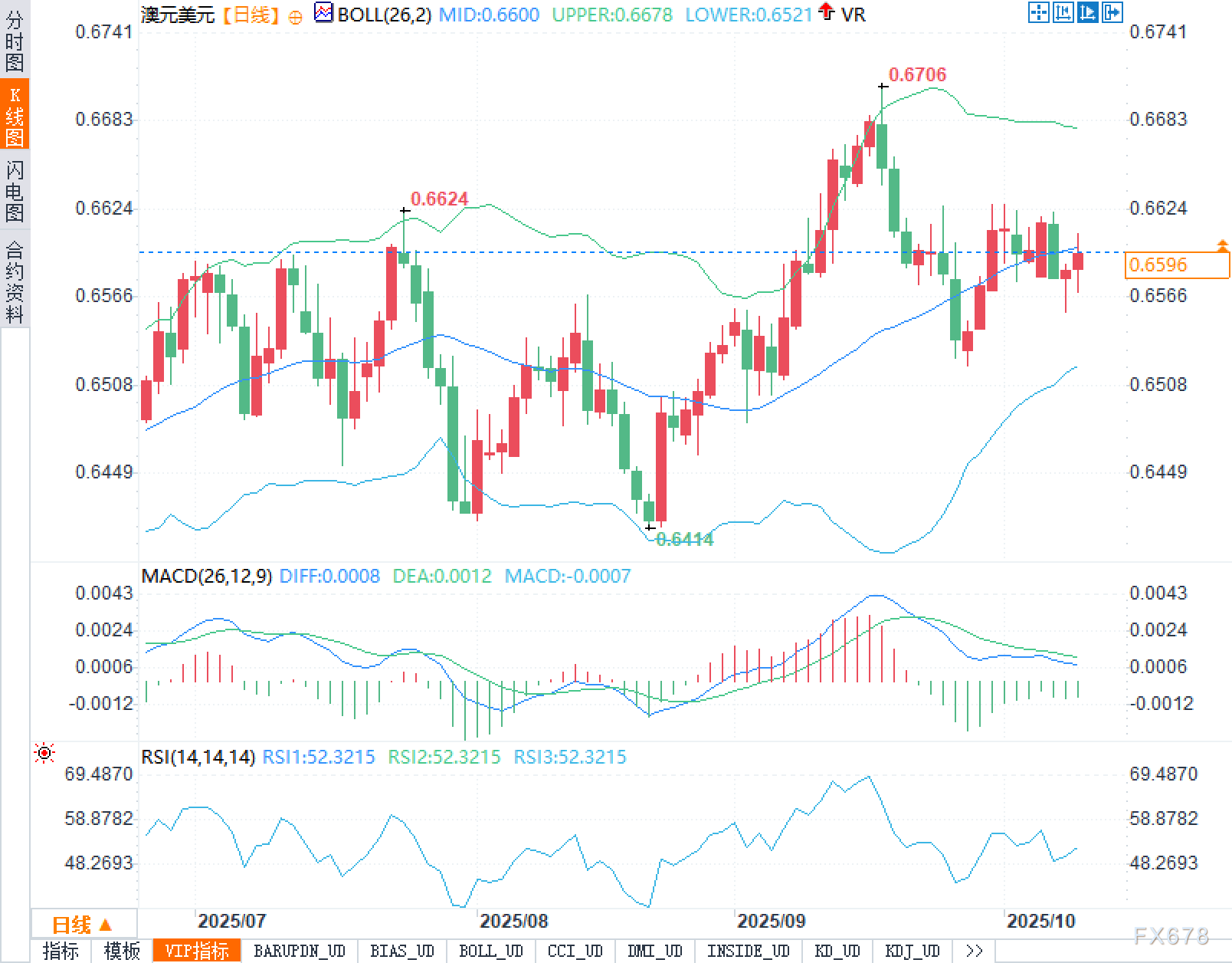 汇通财经APP讯——周四(10月9日)欧洲时段,澳元兑美元围绕0.66盘整。日内焦点指向20:30的美联储主席鲍威尔讲话;周五还有密歇根10月消费者信心与通胀预期初值。汇价高点0.6706尚未被收复,而低点0.6414依然遥立于下方,短线呈“盘整—等待催化”的典型状态。