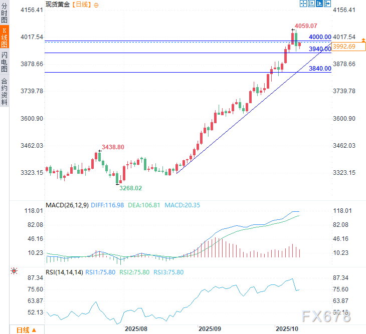 周五(北京时间10月10日)亚市早盘,现货黄金交投于3984.70美元/盎司附近,金价周四自历史高位4059.07美元/盎司回落,因美元走高,以及黄金投资者在以色列与哈马斯达成停火协议后获利了结;美原...