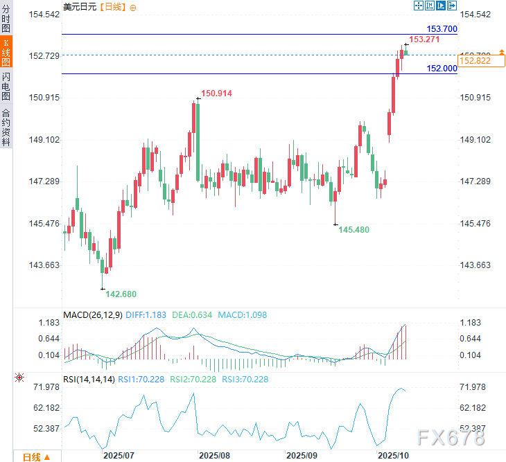 汇通财经APP讯——尽管美元整体走强,周五(10月10日)亚市时段,美元兑日元在触及2月13日以来新高(153.27)后略有下降,不过下行空间受限。市场人士普遍预测,自民党领导层选举出现意外结果后,新任党魁高市早苗或将推出更具财政扩张性的政策,这可能进一步推迟日本央行的货币政策紧缩进程——这也正是本周初以来日元持续下挫的关键诱因。