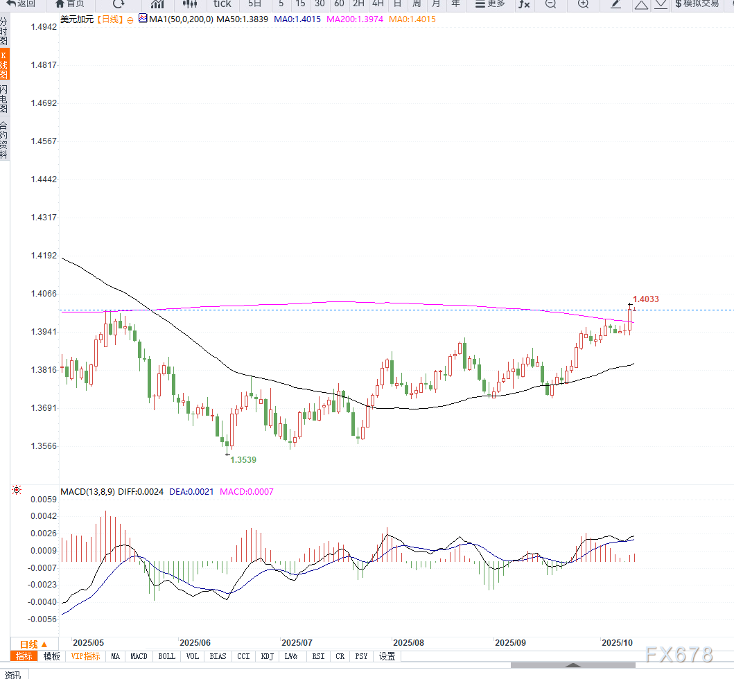 汇通财经APP讯——周五亚洲交易时段,美元兑加元小幅整理,交投于1.4020附近,维持在六个月高位区间。前一交易日该货币对上涨约0.5%,主要受到油价走低及市场避险情绪升温的推动。