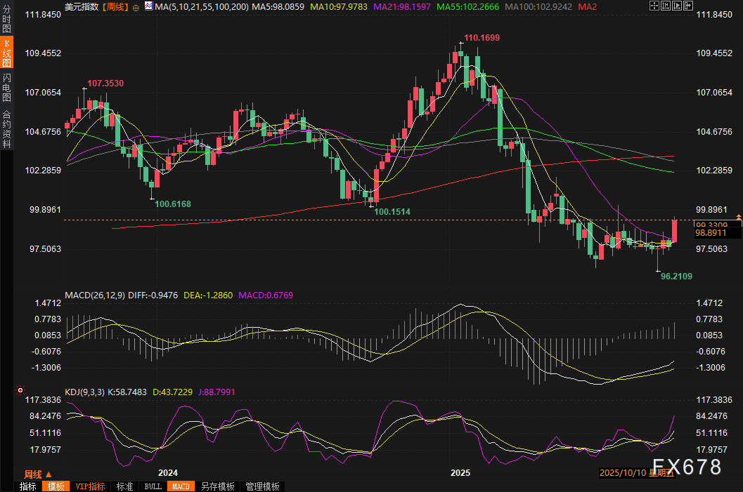 10月10日 15:32截至10月10日10时,美元指数报99.43,较昨日收盘价98.87上涨0.56%,盘中最高触及99.51,创下近两个月以来的反弹新高。这一走势与上周的震荡下行形成鲜明对比,显示短期买盘力量正在积聚。...