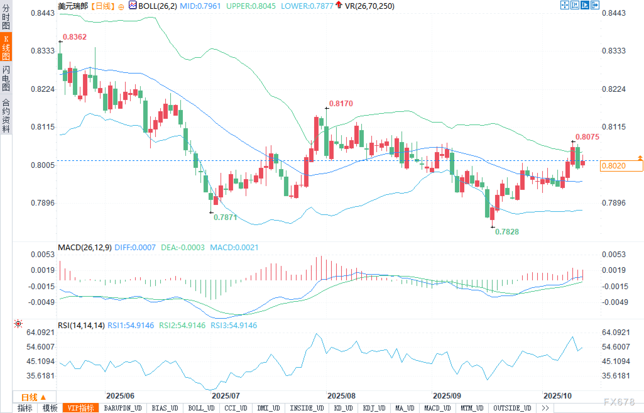 汇通财经APP讯——周一(10月13日),美元兑瑞郎欧洲时段在0.8000整数关口上方交投。上周五汇价近1%的快速回撤后,周初未见延续性抛压,更多体现为围绕关口的横盘整理;短线动能有修复迹象,但上方阻力密集,方向选择仍在酝酿之中。