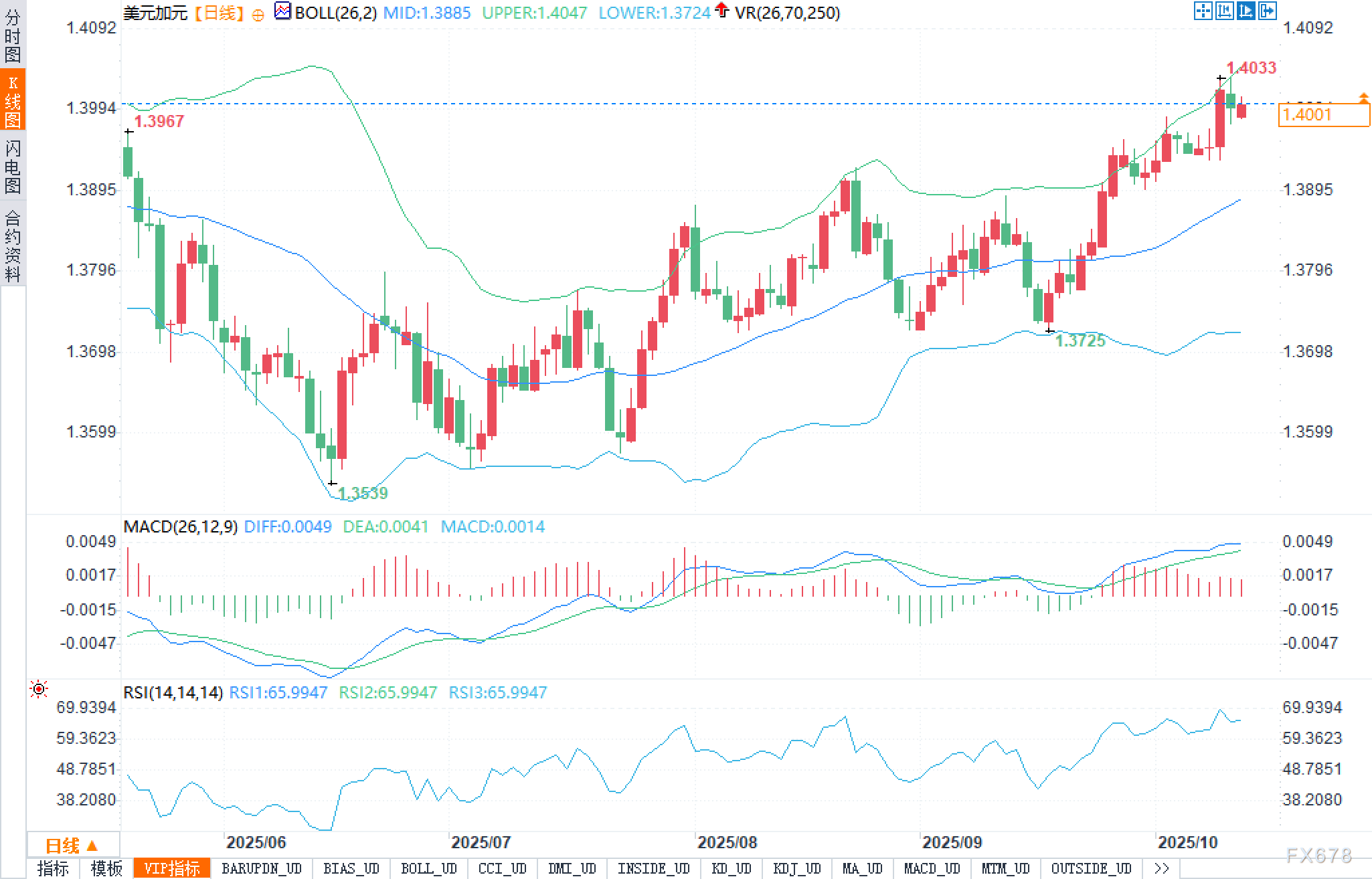 汇通财经APP讯——周一(10月13日),美元兑加元欧洲时段围绕1.4000交投。汇价延续9月以来的上升趋势,逼近前高1.4033与布林带上轨1.4047,形成对上方整数与历史价位的连续压迫。基本面层面,美加两端的消息交错发力:加拿大9月就业大超出预期、美国10月密歇根消费者信心小幅好于市场预判且美元对此正向反应,叠加10月24日将公布的美国9月CPI,使得短线波动率与方向博弈同步升温。