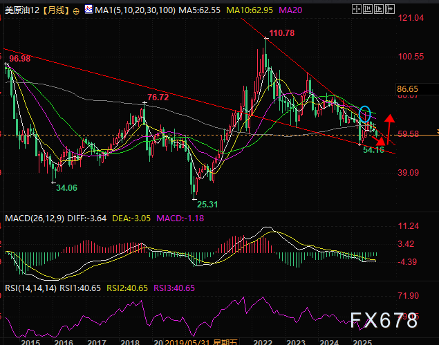 从美原油12月期货合约的月线可以看出,油价经过了3年的下跌,目前处在下降楔形走势之中而6月的假突破,则可能暗示油价或者进一步下跌,目前压力位为下降趋势线,如果油价无法下探到楔形下轨,则有机会再次寻找突破上轨的机会。