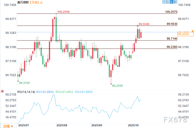 汇通财经APP讯——周一(10月13日)美盘时段,美元指数(DXY)小幅反弹,涨幅0.48%,报99.323,收复上周五因特朗普总统强硬关税言论引发的部分失地。