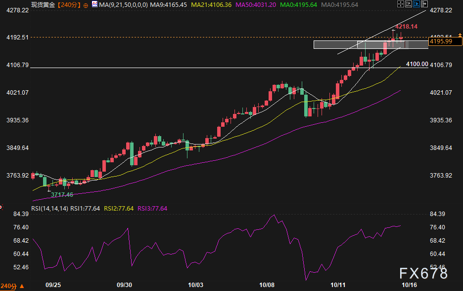 汇通财经APP讯——周三(10月15日)美盘时段,现货黄金延续破纪录走势,突破4200美元关口创下历史新高。强劲的避险资金流入推升需求,支撑金价走高。受全球经济与政治不确定性持续存在、以及市场对美联储宽松立场预期升温的双重支撑,金价几乎每日都在刷新历史高点。