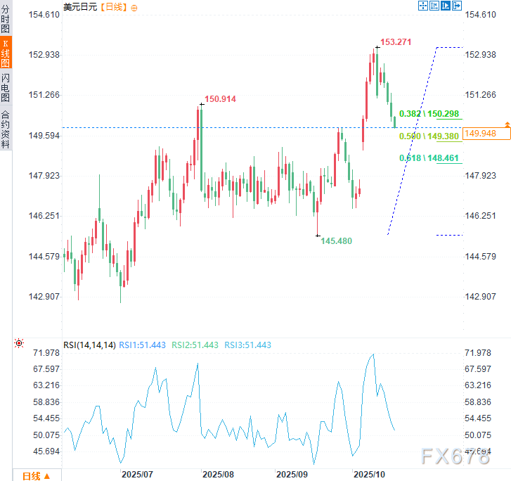 汇通财经APP讯——美元兑日元连续四个交易日下跌,并于周五(10月17日)亚市一度触及近两周低点(149.90),跌幅约0.30%。贸易关系再现紧张迹象,加之持续的地缘政治不确定性,抑制了投资者对风险资产的偏好,并推动部分避险资金流向日元。此外,对日本财政健康担忧的缓解,也是推动过去一周左右日元走强的因素。