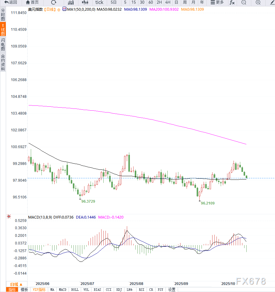 10月17日 15:21汇通财经APP讯——周五亚洲早盘,美元指数继续走弱,报98.20,创下近一个月新低,已连续四个交易日收跌。投资者在多重风险事件下趋于谨慎,美元避险属性受到削弱。 首先,美国政府停摆僵局持续拖累市场信心...
