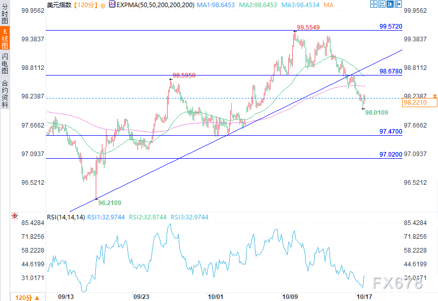 汇通财经APP讯——周五(10月17日)欧洲交易时段,美元指数(DXY)进一步下滑至98.21附近,录得连续第四个交易日下跌。美国政府长期停摆、市场对美联储降息的猜测,以及贸易紧张局势再起,均对市场情绪构成压力,投资者仍持谨慎态度。