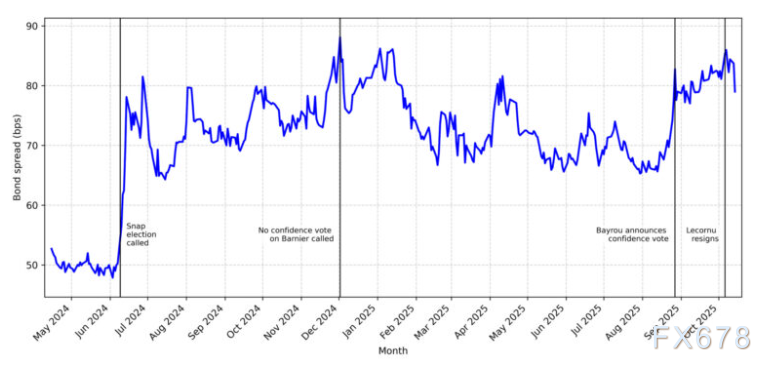 自2022年7月27日欧洲央行开启疫情后加息周期,至2024年6月9日法国突然举行议会选举期间,10年期法国国债与德国国债的平均利差为53个基点,与欧元区危机后的平均水平一致。而在选举日至2025年10月16日期间,这一利差平均值升至74个基点。这21个基点的差额正是债券投资者为补偿政治不稳定风险所要求的额外收益率。
