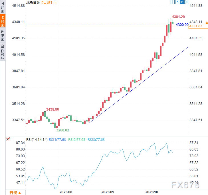 汇通财经APP讯——周二(10月21日),现货黄金从前一交易日创下的历史高点(4381.29美元/盎司)附近小幅回落,跌幅约0.8%,但在积极的基本面背景下,任何实质性下跌空间仍显有限。