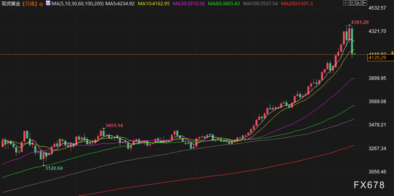 现货金大跌5.5%,至每盎司4115.26美元的一周低点,创2020年8月以来最大跌幅。美国12月期金收跌5.7%,报每盎司4109.10美元。