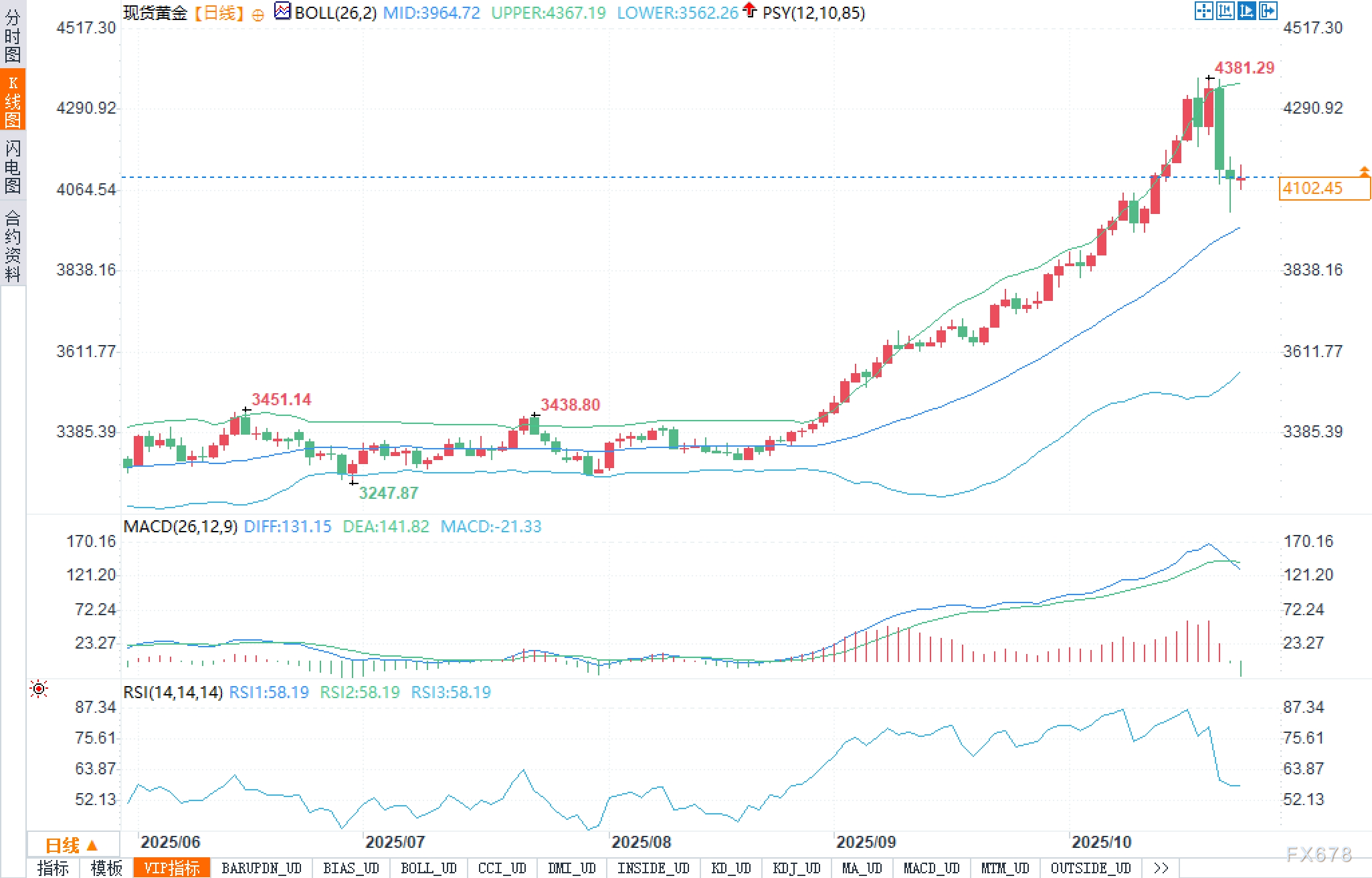 汇通财经APP讯——周四(10月23日),现货黄金美市盘前于4100美元上方交投。此前冲高至4381.29美元后回落,短线受美元阶段性走强压制,但宏观对冲需求依旧稳固。权益市场波动扩大、部分科技权重业绩不及预期、俄相关能源企业遭制裁等消息共同放大避险偏好;与此同时,市场对美联储年内政策路径与通胀粘性仍存分歧,令黄金在高位呈现“快涨后降速”的节奏。