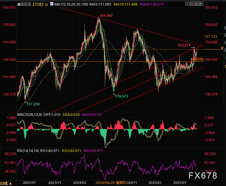 汇通财经APP讯—— 周三(10月24日)美元兑日元继续反弹,日本9月CPI录得2.9超出预期,由于市场对高市交易的押注,日元并没有停止贬值,同时日本首相高市早苗周五表态称,“经济优先、财政随后”的原则将是其施政方针的基础。高市早苗进一步指出,她会在“负责任的积极财政政策”理念下,战略性推进财政支出落地,市场押注日本央行保持利率不变,并且之后政府将出台更多宽松政策,这些推升了美元兑日元的上涨。