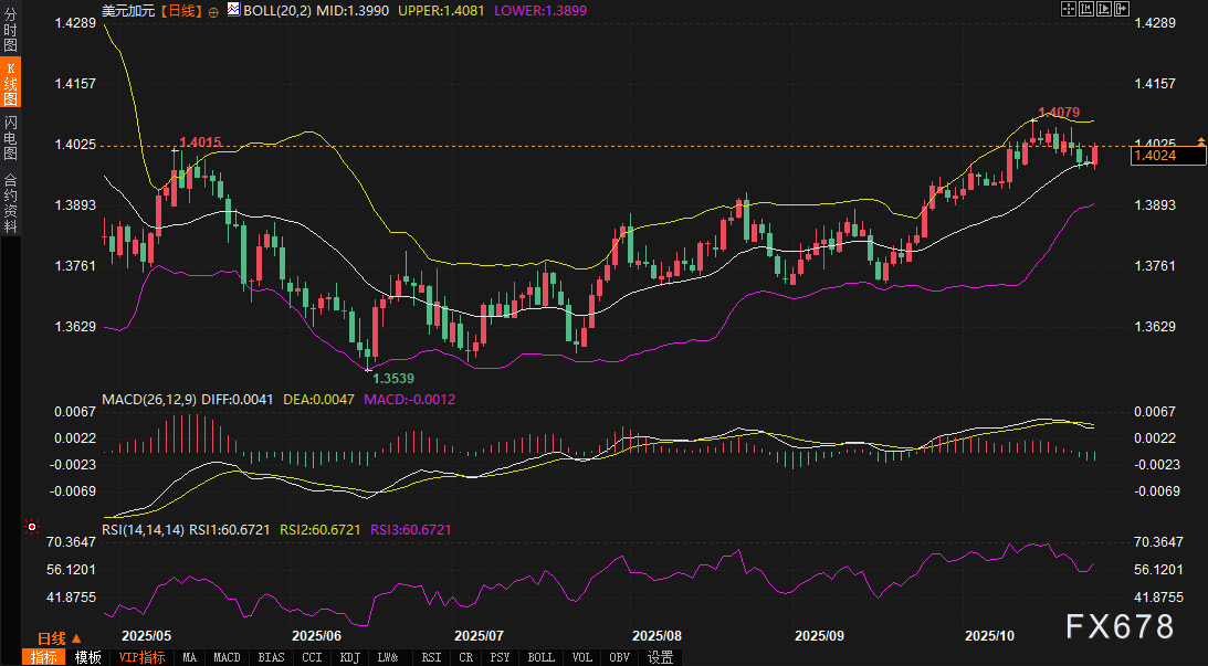 汇通财经APP讯——周五(10月24日),外汇市场再度聚焦北美货币对,美元兑加元汇率报1.4027,较前一交易日上涨0.26%。这一波段内升势源于加元在基本面不确定性下的疲软表现,同时美元指数维持在相对强势区间。近期市场情绪受加拿大经济数据和央行政策预期主导,叠加外部贸易摩擦的回响,加元整体走势趋于防守。交易盘面显示,USD/CAD自上周低点1.3899附近反弹,短期动能虽有放缓迹象,但仍未见明显回调信号。这反映出投资者对加拿大央行下周决策的谨慎态度,尤其在通胀回升与经济增长放缓并存的背景下。