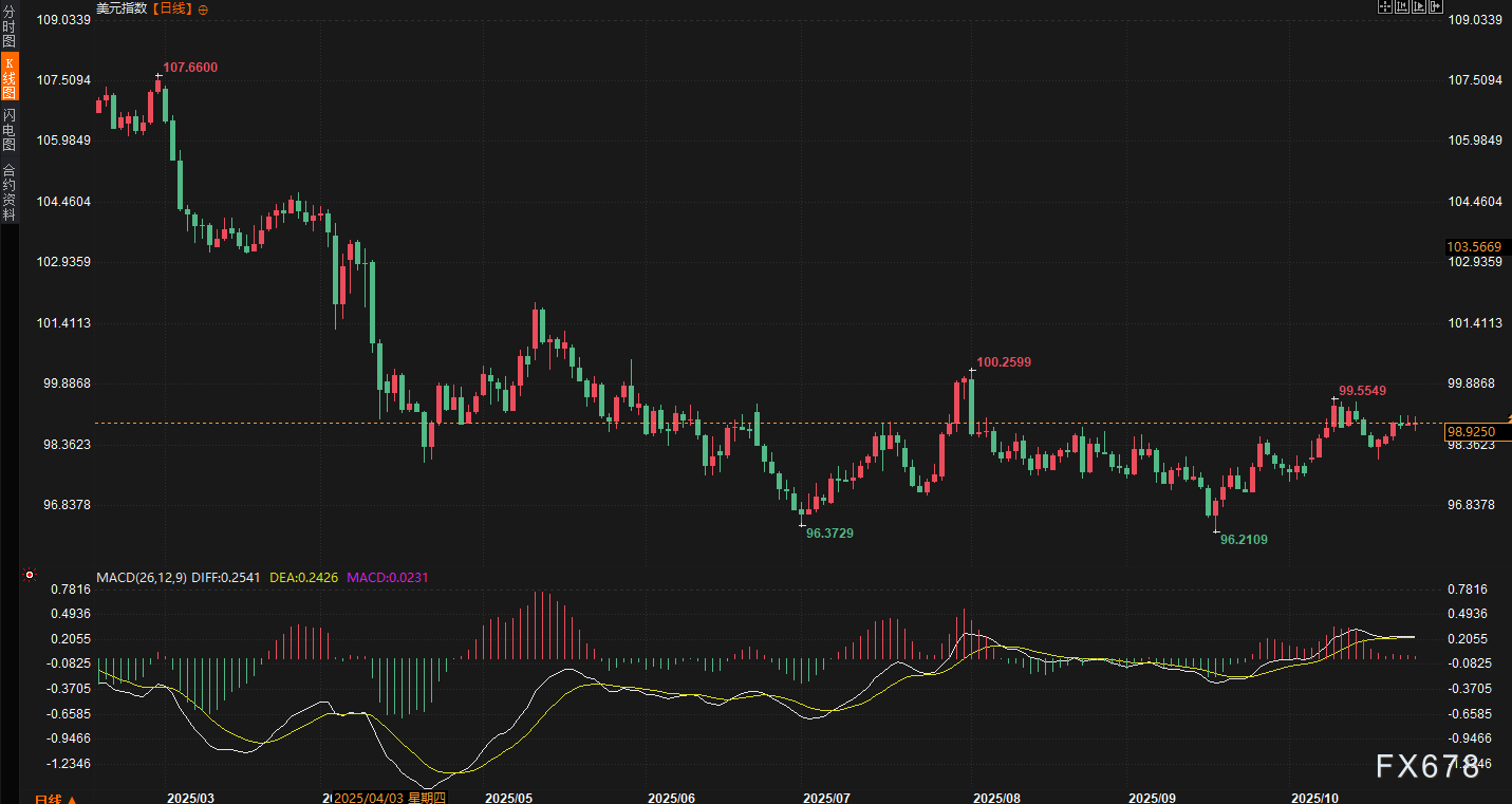 汇通财经APP讯——周五(10月24日),欧洲时段美元指数位于99附近。行情围绕99关口反复拉锯,波动率温和,未形成单边惯性。盘面结构显示,多空均有抓手:一方面,宏观数据预期指向通胀边际黏性但整体可控...
