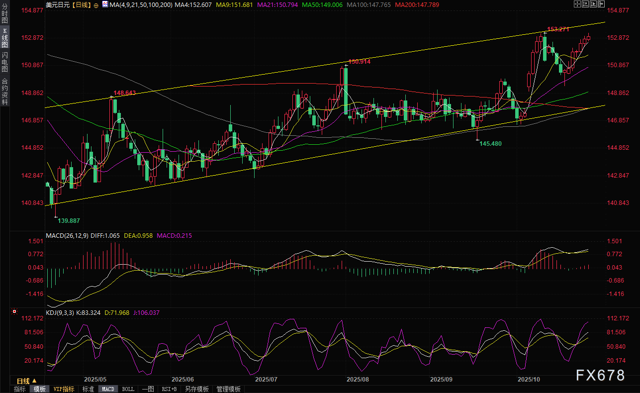汇通财经APP讯——日元(JPY)兑美元连续第七天下跌,因市场预期日本新首相高市早苗将推行扩张性支出政策并抵制早期收紧政策。此外,中美贸易紧张局势缓和的迹象也削弱了避险日元的需求,推动美元/日元在周一(10月27日)亚洲时段升至两周多高点,最高触及153.25,接近10月10日创下的近八个月高点153.27;目前小幅回落至153.05附近。
