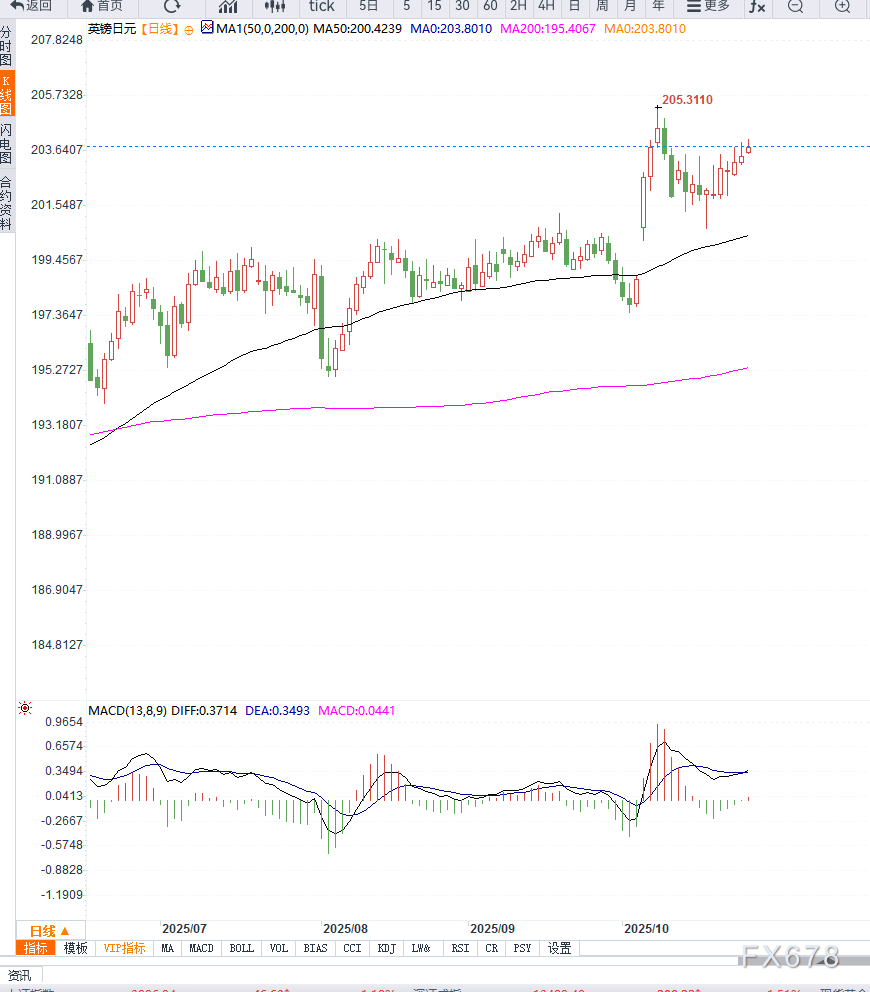 汇通财经APP讯——GBP/JPY在周一持续走高,因日元在市场风险偏好回暖及财政预期升温背景下继续走弱。新任日本首相计划扩大财政开支,并提高国防预算,使投资者担忧日本财政承压,从而削弱日元吸引力。