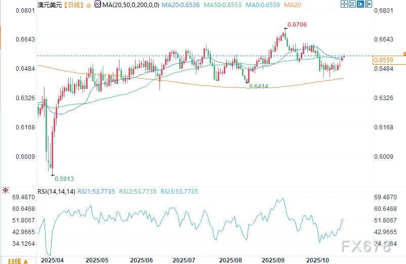 汇通财经APP讯——周二(10月28日)欧盘时段,澳元兑美元日内以震荡为主。近期贸易紧张局势缓解,且交易员正等待美国与澳大利亚的关键事件,澳元兑美元货币对跳空高开,攀升至10月10日以来的最高水平。该货币对从本月0.6440的低点上涨,最高触及0.6563。