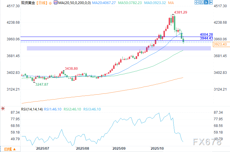 市场已明确跌破4100.43美元的枢纽位,以及4004.28美元和3944.43美元的两个摆动低点。随着这些支撑位被突破,黄金市场似乎准备测试下一个主要区域,即3846.50美元的50%回撤位和3782.23美元的50日均线之间的区间。