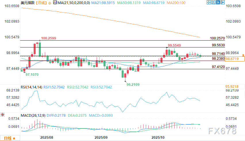 汇通财经APP讯——周二(10月28日),美元指数在周二盘中承压,延续了自10月22日高点99.139以来的四日回调,跌至98.668。价格已突破98.797的小枢纽点和98.650的61.8%回撤位,今日低点触及98.565。交易员们正在关注98.132的50日移动平均线,它可能成为逢低买入者的支撑位,也可能在失守后引发向97.462的更深幅下跌。