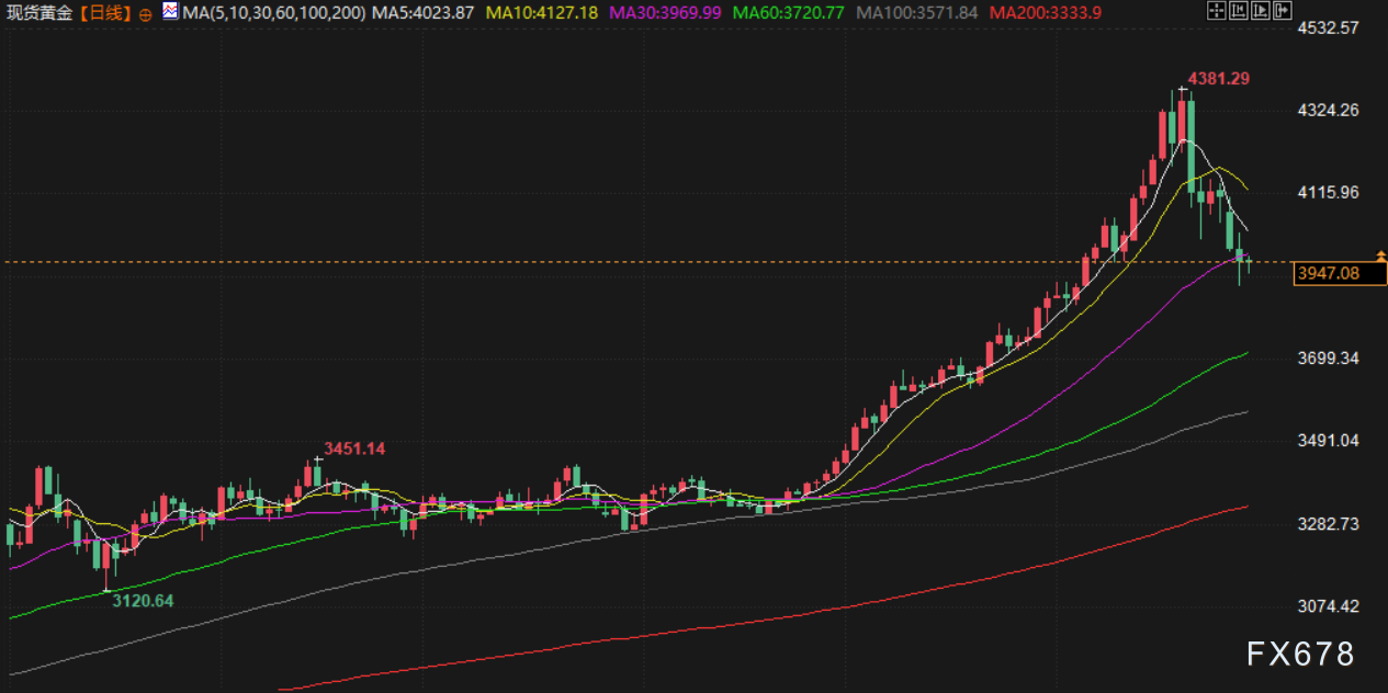现货金下跌0.4%,至每盎司3964.35美元,盘中触及10月6日以来最低。美国期金下跌0.9%,收报每盎司3983.1美元。
